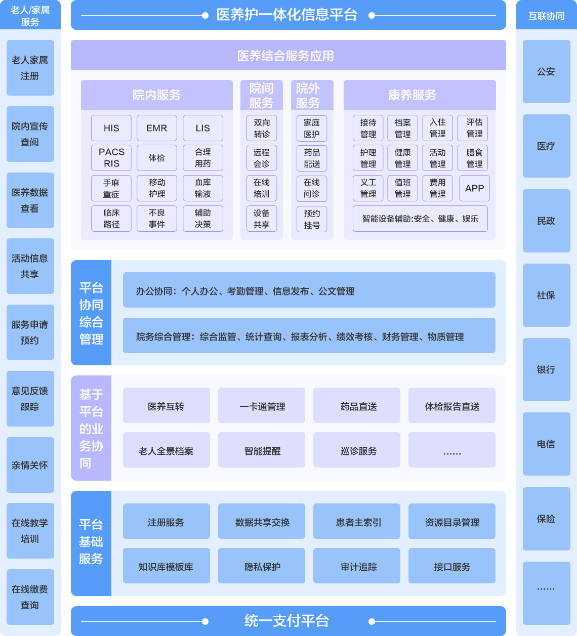 支持以醫療服務為核心、以公衛服務為核心和以康養服務為核心的不同模式的醫養結合信息化服務體系。