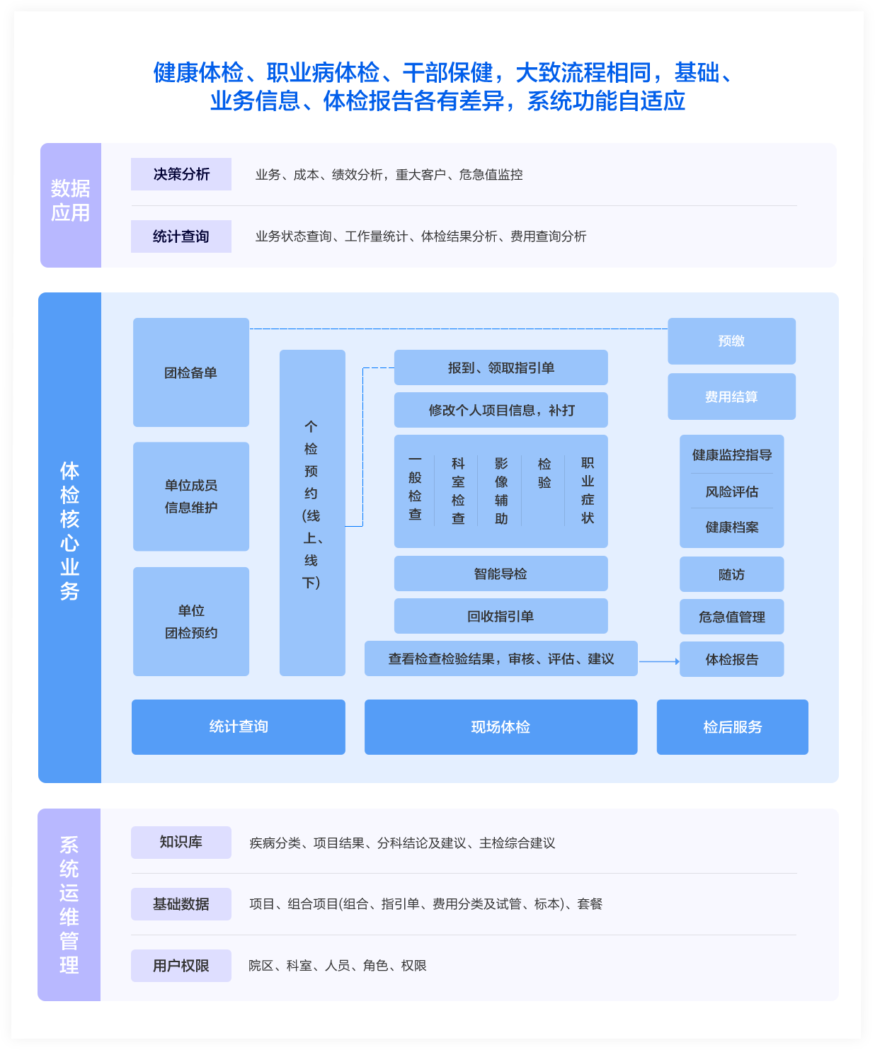 網上咨詢與預約、現場報到與檢查、檢后回訪與健康管理,業務閉環,持續監控、改進健康指標。